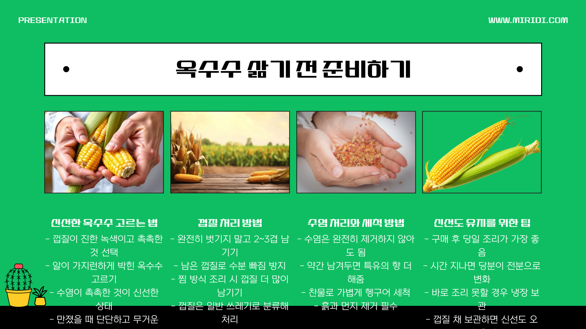 | 옥수수 선택 | 알이 가지런하고 촉촉한 껍질 |